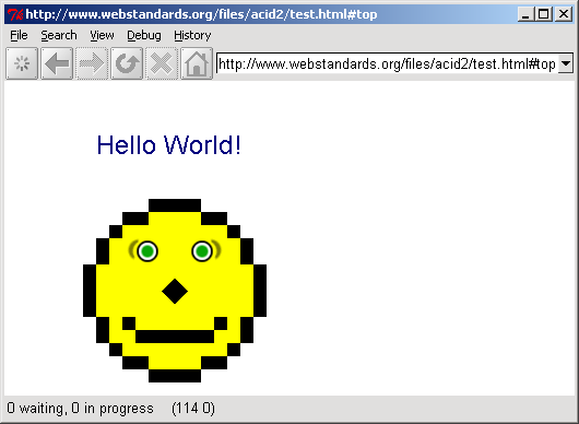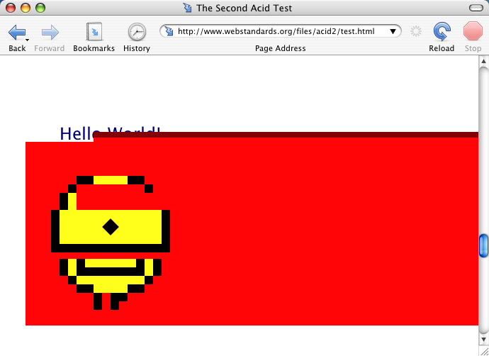 This is a series of screenshots of current major browsers (or browsers that pass), rendering the Acid 2 test. Each can be compared with the screenshots of Internet Explorer's current releases - currently the most popular browser, and also the one with the poorest support for Internet standards. Congratulations to everyone who passes; Safari, Prince, Opera, iCab, Konqueror, (future) Mozilla/Firefox, Obigo, Tkhtml, and finally Internet Explorer. You help to make the Web a more reliable place for Web developers.