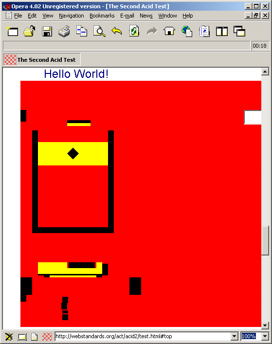 Note, however, that users have reported - with screenshots - that subsequent releases clearly fail the test. Without knowing the version number that is expected to pass, it is not possible to know if the version that fails is one of the versions that Telca claimed should pass. It must be noted, however, that the released version fails due to only one remaining bug, and it is unlikely that it would be a build created from a branch just before the last bug was fixed in order to allow it to pass. It is probably a subsequent release that was supposed to pass, but in actual fact has regressed to a point where it now fails. Thus it could be safely assumed that Obigo does not, in fact, pass the Acid 2 test, and only briefly passed in an internal build that was never publically released. This could (depending on your definition) constitute an overall fail.